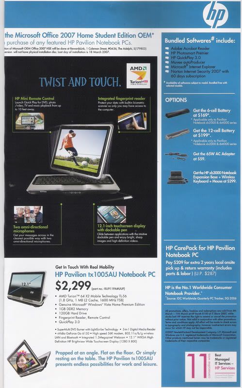 Mm, so I went to Parkway Parade's Harvey Norman to look out for a tablet PC. Apparently they don't sell Fujitsu notebooks there, but there's one nice looking tablet from HP.