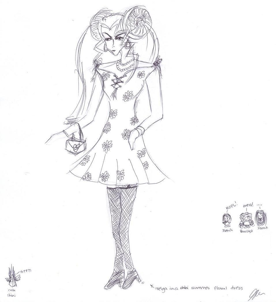 Spazzed out at Macs. Yes, the same Mac where we spazzed out the weeks before. Cain-nii managed to doodle Helga in a floral dress.